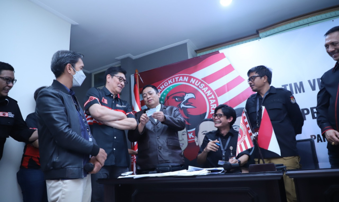 Di sana, Bagja disambut jajaran pengurus Partai Gelora beserta Anggota KPU Betty Epsilon Idroos dan juga Yulianto Sudrajat yang terlebih dahulu hadir.