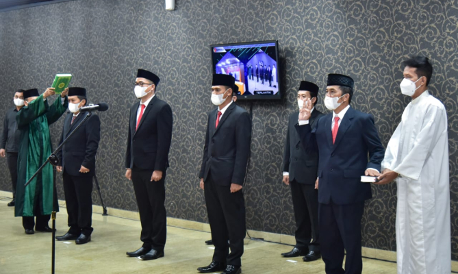 Ketua Bawaslu saat membacakan sumpah jabatan pelantikan enam pimpinan Bawaslu Kabupaten di Jakarta, Selasa 9 November 2021/Foto: Pemberitaan dan Publikasi Bawaslu RI