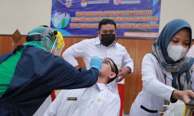 Bawaslu Kalsel tengah melakukan tes antigen jelang penyelenggaraan Pemungutan Suara Ulang Pilgub Kalsel 2020 di Kantor Bawaslu Kalsel pada Rabu 2 Juni 2021/ Foto: Henry (Humas Bawaslu Kalsel)